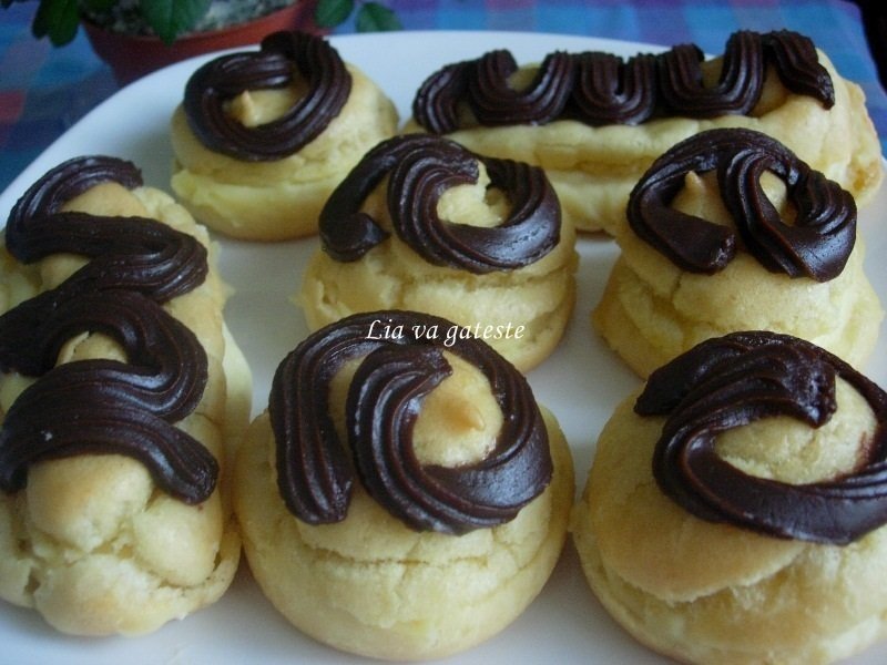 Sectionam eclerele reci, in doua si le umplem cu crema de vanilie. Deasupra ornam cu glazura pe care am obtinut-o amestecand( pe aburi) nutella cu untul.