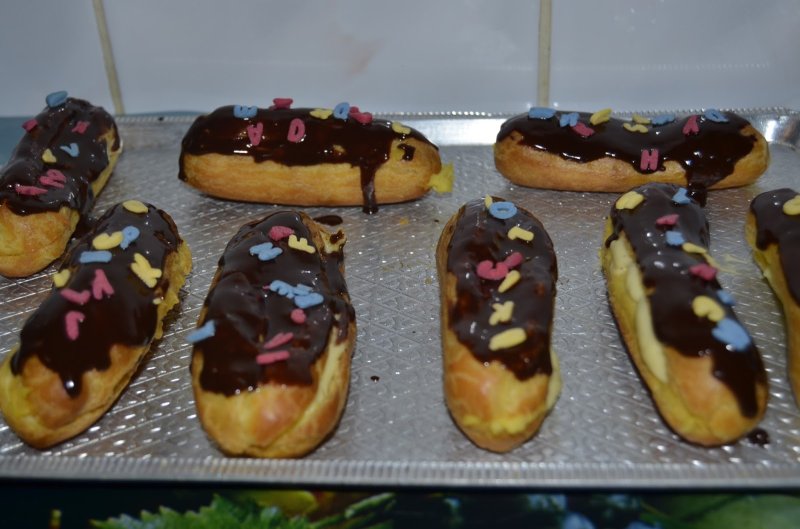 -Cu ciocolata topita se orneaza eclerele.Se stropesc apoi cu ornamente de zahar.Sa aveti pofta dragilor!
