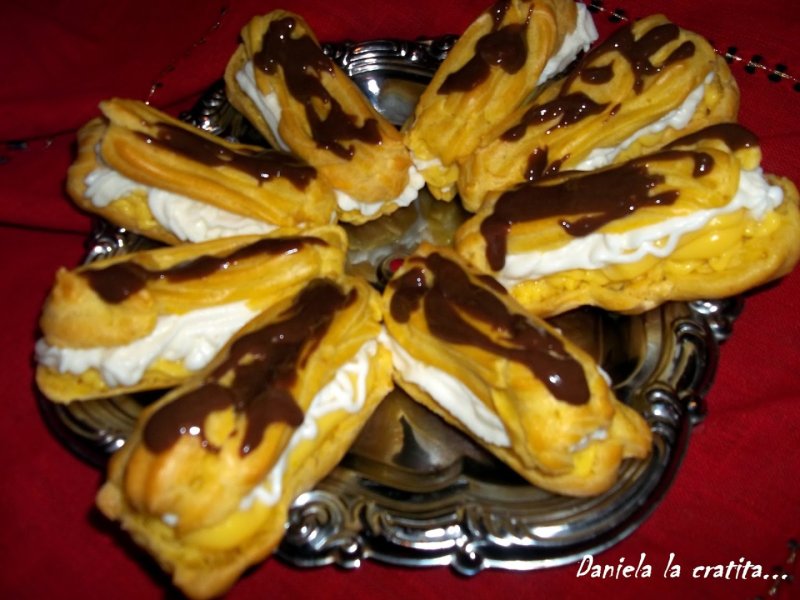 Pentru inceput vom face cojile eclerelor.Pentru aceasta vom turna intr-un vas apa si uleiul si se vom pune pe aragaz la foc.Cand incep sa fiarba se da deoparte si se adauga toata faina odata amestecand bine pana se face un aluat.Lasam sa se racoreasca.Adaugam apoi ouale unul cate unul pana ce le incorporam pe toate.Rezulta o compozitie nici prea subtire,dar nici prea groasa.Tapetam o tava cu hartie de copt,iar cu ajutorul unui pos facem bastonase(gramajoare).Se introduce tava la cuptor pentru 25 minute,avand grija ca in primele 10 minute focul sa fie iute si sa nu deschidem usa cuptorului,iar apoi miscoram flacara si lasam sa se coaca.