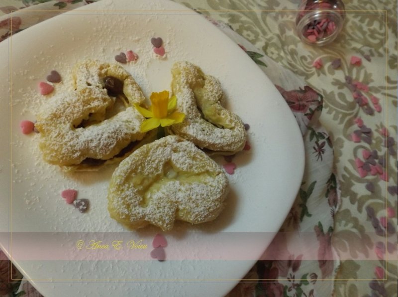 La final, se asaza eclerurile pe un platou, se pudreaza cu zahar si se decoreaza cu coaja de portocala si inimioare-decor.