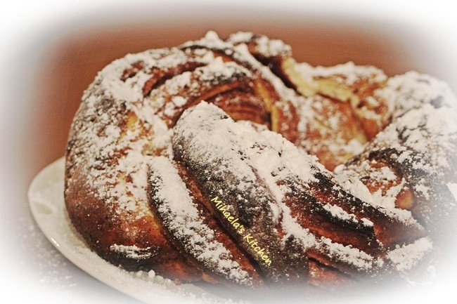 Am rulat foaia si apoi am taiat-o pe jumatate de-a lungul sulului. Incercati sa nu taiati cap-coada si sa lasati cam de 2-3 degete cat grosimea de cand incepeti taietura. Apoi o impletiti strans in doua si lipiti capetele intre ele. La cealalta parte de aluat ramasa , repetati operatiunea ca la primul cozonac. Peste suprafata colacului se unge cu sosul ramas.