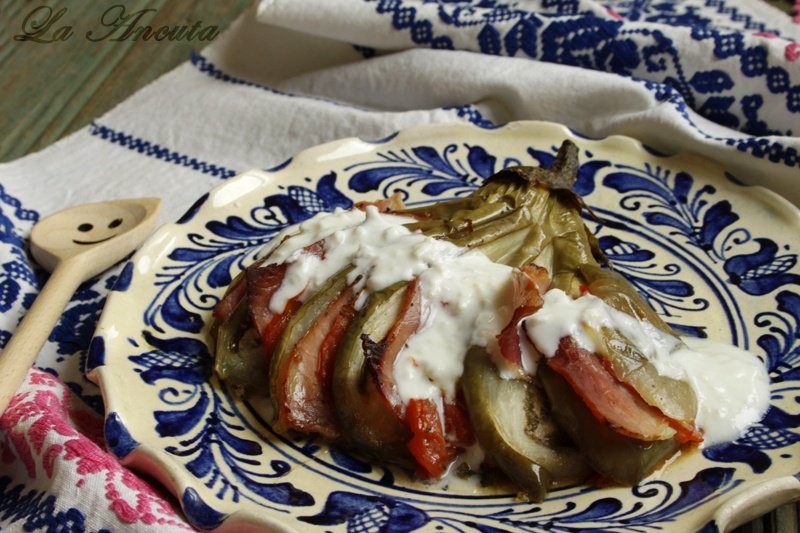 Intre feliile de vinete punem cate o felie de rosie, una de jambon si una de mozzarella. Adaugam si cateva feliute de usturoi.