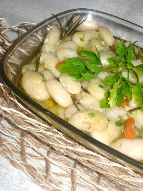 Se tine fasolea la inmuiat in apa rece(de obicei eu o tin de seara pana dimineata)Se pune la fiert,se spumeaza si se schimba apa de doua ori dupa care punem fasolea in oala si adaugam apa atata cat sa depaseasca cu putin fasolea..Adaugam morcovul si cateii de usturoi taiati rondele,rosmarinul,salvia si 2 linguri cu ulei de masline.Condimentam cu sare si piper.Se da la foc sub capac si se lasa sa fiarba la foc potrivit,avand grija ca din cand in cand sa amestecam.