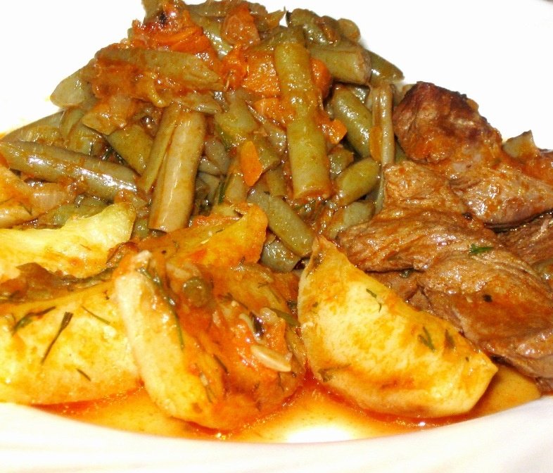 Spalam carnea si o taiem bucati potrivite.O condimentam cu sare .Intr-o cratita incingem ulei si adaugam carnea. Lasam pana cand apa pe care o lasa carnea se evapora iar apoi aceasta o rumenim pe ambele parti .Avem grija sa amestecam din cand in cand ..Cand carnea este frumos rumenita o scoatem pe un prosop absorbant .Curatam ardeiul,ceapa si morcovul si le spalam .Ardeiul il taiem cubulete,ceapa o taiem marunt iar morcovul il dam prin razatoare.In uleiul in care am rumenit carnea adaugam legumele si le inabusim circa 4-5 min dupa care adaugam carnea,stingem cu o cana de apa si lasam sa fiarba la foc potrivit pana ce carnea este aproape fiarta.Condimentam dupa gust cu sare si ierburi de provence .Curatam cartofii,ii spalam ,ii taiem in sferturi si ii adaugam in cratita.lasand sa fiarba la foc potrivit circa 10 min. ,timp in care adaugam si fasolea pe care mai intai am trecut-o perintr-un jet de apa rece.La final adaugam marar verde taiat marunt si pasta de rosii si lasam sa mai dea in cateva clocote.