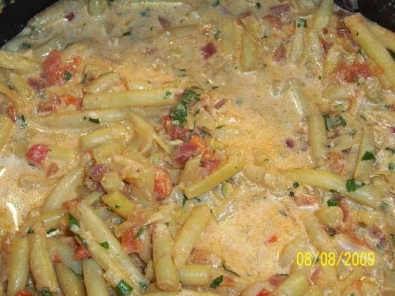 Am fiert fasolea spalata bine cu un pic de sare. Separat intr-o cratita am calit putin la foc mare ceapa si rosia. Am adaugat fasolea si putina supa de legume si am lasat sa mai dea 2-3 clocote. Am adaugat patrunjelul tocat si am facut mujdei de usturoi pe care l-am adaugat la sfarsit dupa ce am luat mancarea de pe foc.