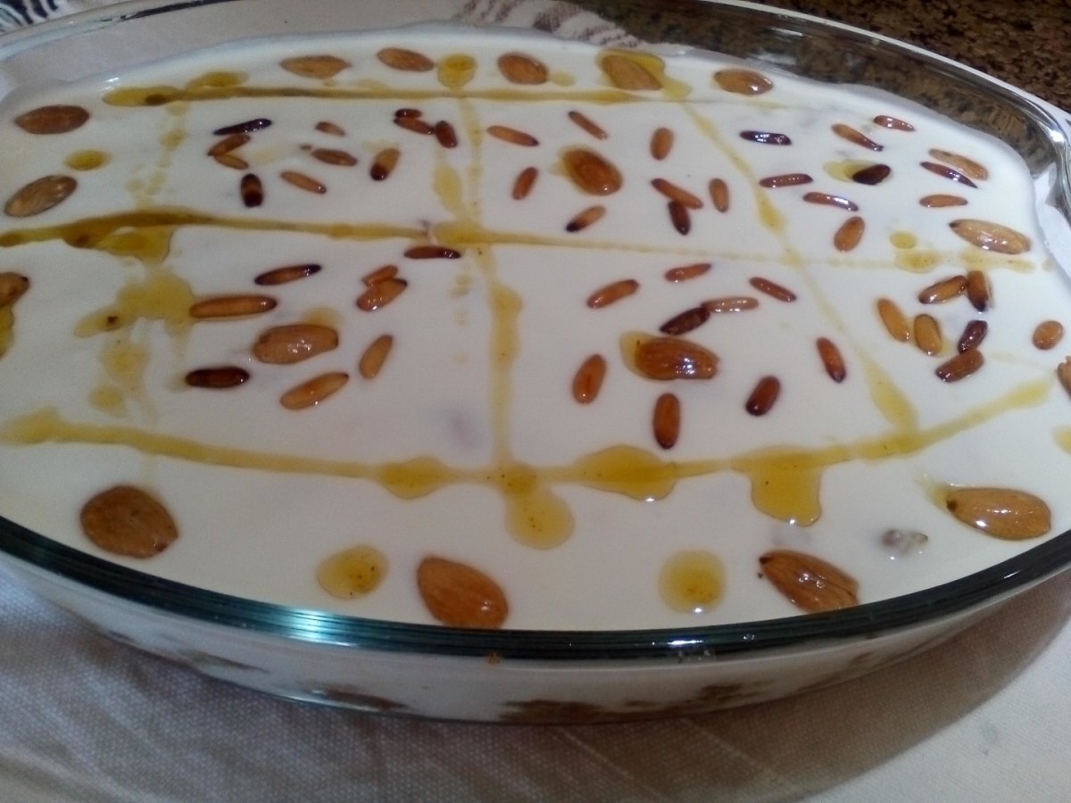 Intre timp, vom deschide cele 3 lipii si le vom taia bucatele mici, apoi le vom praji in uleiul incins, dupa ce se vor rumeni le vom scoate pe hartie absorbanta.Dupa 20 de minute vom usca vinetele cu prosoape de hartie, apoi le prajim in uleiul incins pe ambele parti pana se rumenesc si le vom scoate pe hartie absorbanta.Pana se vor raci bine vinetele, vom prepara sosul.Intr-o cratita vom pune mai bine din jumatate din uleiul de masline in care vom praji 3 catei de usturoi taiati rondele, pana se vor rumeni apoi vom adauga pasta de rosii, sucul de rosii si apa.Lasam sa dea cateva clocote apoi vom adauga vegeta, sare si piper dupa gust si vom mai lasa sa fiarba la foc mic inca 5-7 min.Bucatile de paine prajita le vom aseza intr-un vas yena peste care vom turna sosul fiebinte si lasam 10 min pana cand painea absoarbe integral sosul. Ne ocupam acum de vinete.Vom taia vinetele cubulete mici si le vom aseza peste painea imbibata cu sos(urmariti si imaginile postate, sigur va vor fi de folos).Usturoiul ramas il vom pisa bine cu putina sare si il vom amesteca cu iaurtul apoi il vom intinde deasupra peste vinete intr-un strat uniform.In uleiul de masline ramas vom praji fulgii de migdale si seminte de pin si vom orna suprafata aperitivului, desigur cu tot cu ulei.Vom lasa la temperatura camerei timp de o ora, dupa care se poate servi. Este foarte gustos fie rece sau caldut, mie una imi place a doua zi mai mult, este un aperitiv apetisant si cu un gust deosebit; desigur ca fulgii de migdale si semintele de pin dau o aroma deosebita si placuta acestui aperitiv.