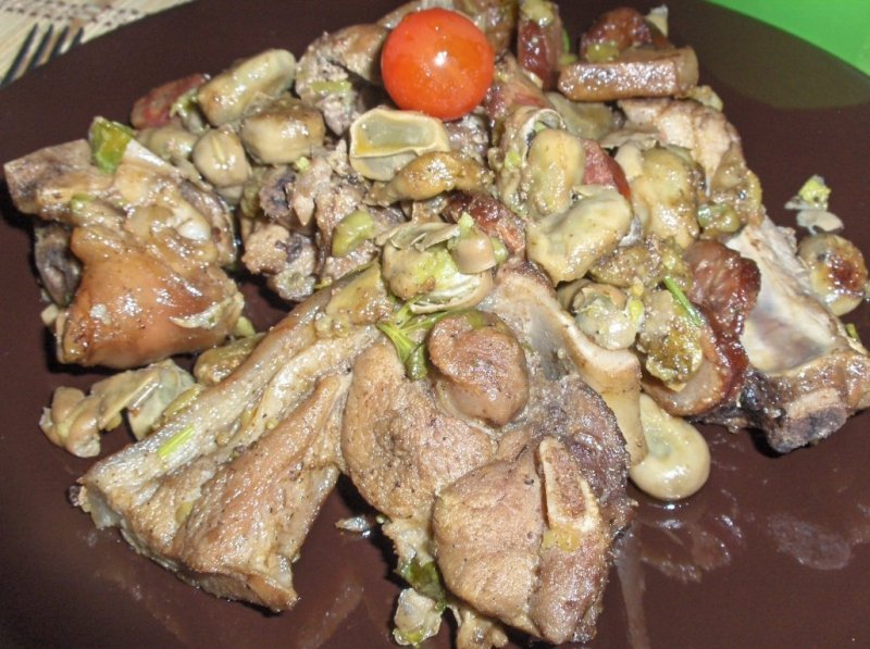 Se pune intr-o oalã de lut cu capac, carnea, cârnati tãiati felii grosute (am renuntat la sângerte, nu mâncãm cu sânge...).