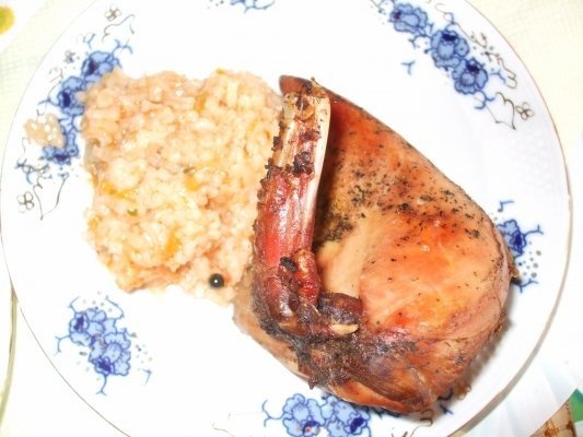 Se acopera tava cu folie de aluminiu si se baga la cuptor la foc potrivit. Din cand in cand se mai ung cu zeama din tava, apoi se pune usturoiul, cimbrul si vinul. Se intoarce o singura data si se lasa sa-si formeze o crusta.