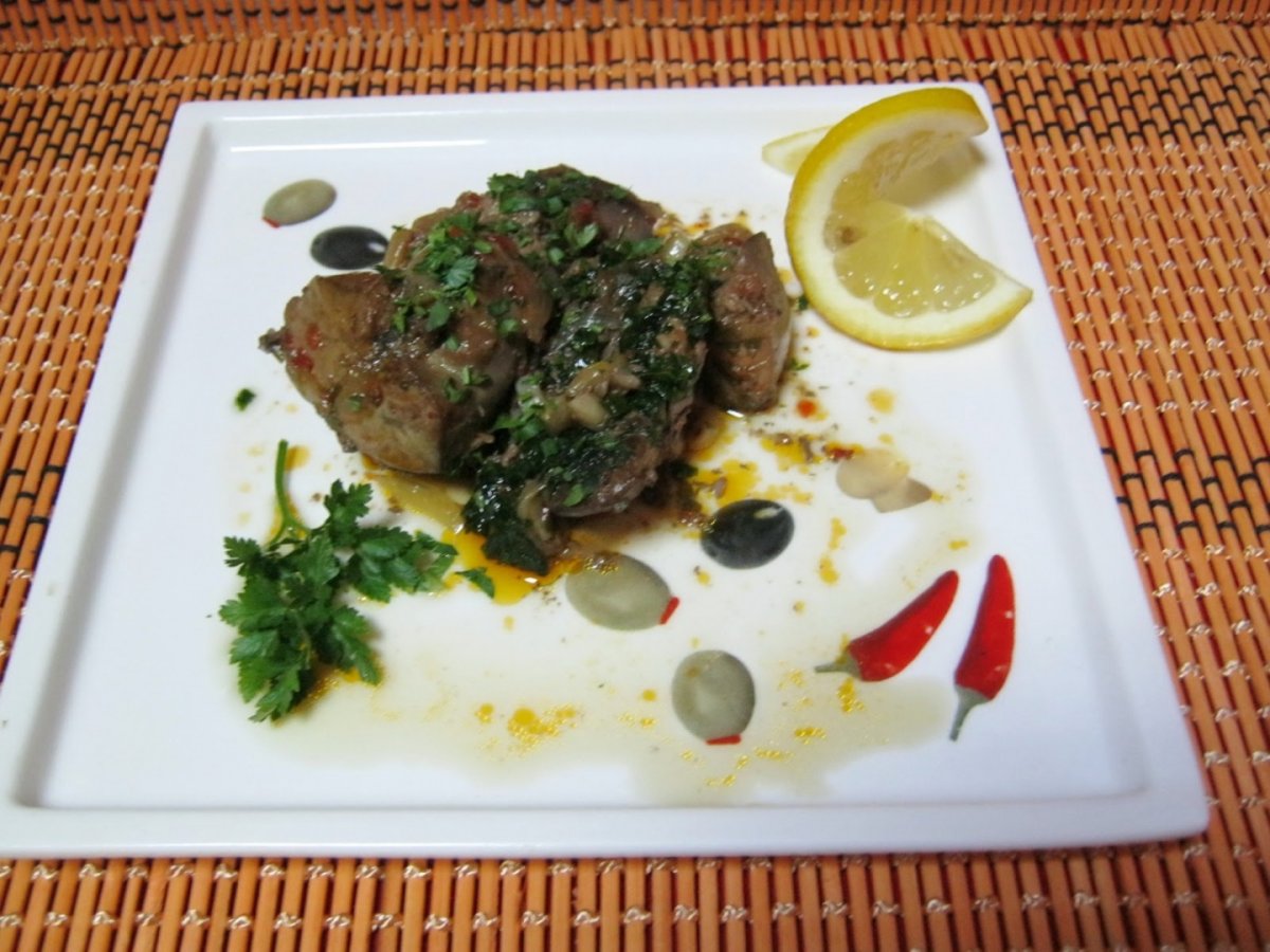 Cand este gata adaugam patrunjelul verde tocat si asezonam.Acum si nu inainte , pentru ca altfel ficatul se inatreste.