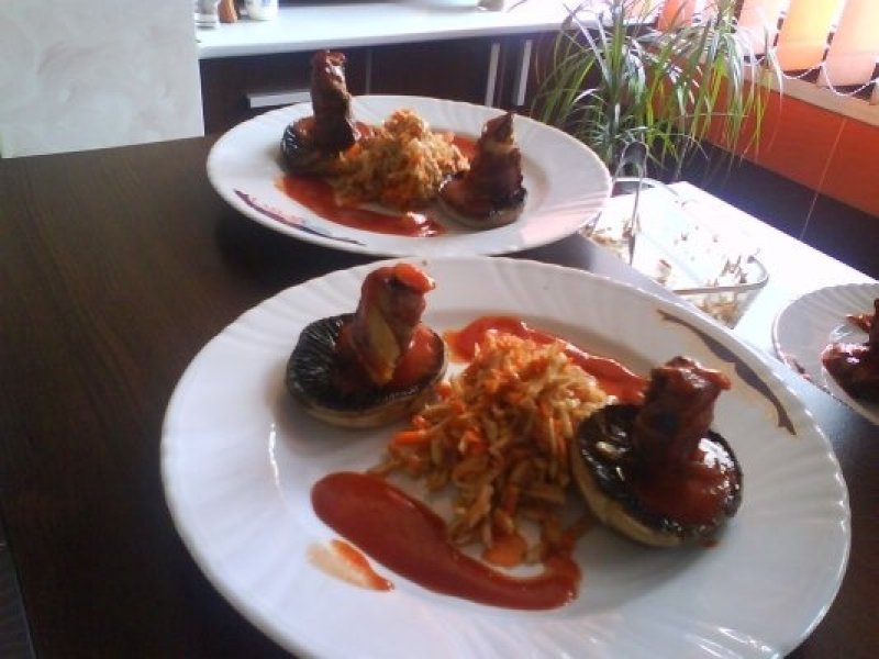 Ficatei se frig pana sunt aproape gata. Apoi se marineaza in sosul format din usturoi, ulei de masline si busuioc, dupa care se invelesc in prosciutto si se dau la cuptor pana se rumenesc. Ciupercile se gratineaza si in locul coditelor se adauga ficateii inveliti in prosciutto.