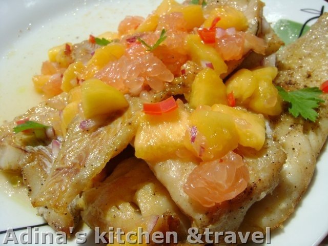 Busuiocul si rozmarinul se amesteca cu sucul de grepfruit, se mai stoarce sucul de la inca o nectarina, se adauga putina sare,chili si o lingurita de miere , se amesteca bine si rezulta un sos delicios.