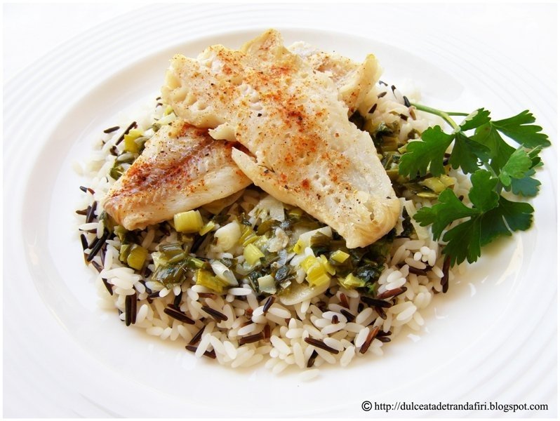 Cand pestele e gata asezi in farfurie un strat de orez, unul de verdeturi si fileurile de peste. Pofta buna!