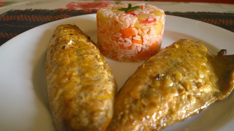 Între timp, punem și orezul la fiert, legumele le tăiem cubulețe și le călim în puțin ulei încins, iar după ce s-a fiert orezul, îl adăugăm peste amestecul de legume, condimentăm și tragem de-o parte.