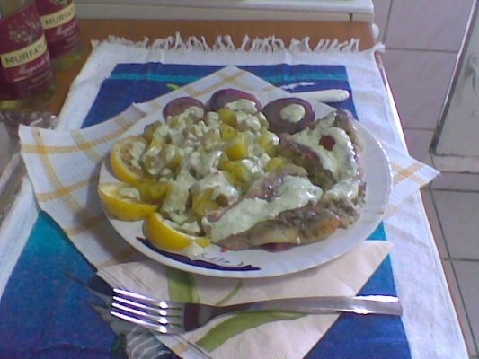 Bagam la cuptor in tava fileurile,pe care in prealabil le ornam si le motzam cu ce dorim si ne place.Punem sare,piper,menta uscata sau menta proaspata,iar la urma punem un pahar de vin alb peste si bagam in cuptor pentru 30 sau 35 de minute(pestele se face imediat, eu pun folie pe deasupra, pentru ca nu imi place pestele sa fie uscat, imi place mai in sucul in care il preparam).Este o mancare usoara,satioasa si foarte sanatoasa.Separat se pun cartofii intr-o tava si se baga si ei la cuptor circa 45 de minute.Eu peste cartofi pun cateva cubulete de unt,sare,piper,menta uscata si o ceasca de apa,ca sa ramana fragezi.Peste tava vin cu o folie de aluminiu.Sosul de Tzatzichi se face din usturoi pisat cu iaurt si condimentele pe care le dorim.Pofta buna !!!