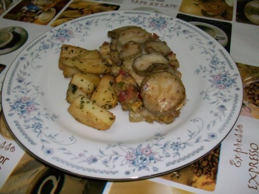 Se pun intr-o tava,neunsa.Peste compozitia aceasta se pune fileul de peste(curat,sarat,pperat,acrit cu suc de lamiie).Deasupra pestelui se pun rondelele de dovlecel(prajite);se pun cca 4 linguri de ulei de masline,pe legumele(care se vad),din tava.