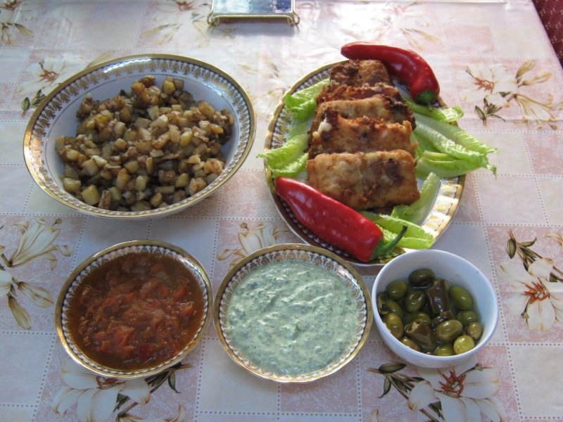Se serveste pestele cu rosiile scazute, cartofii prajiti si salata de patrunjel cu iaurt.