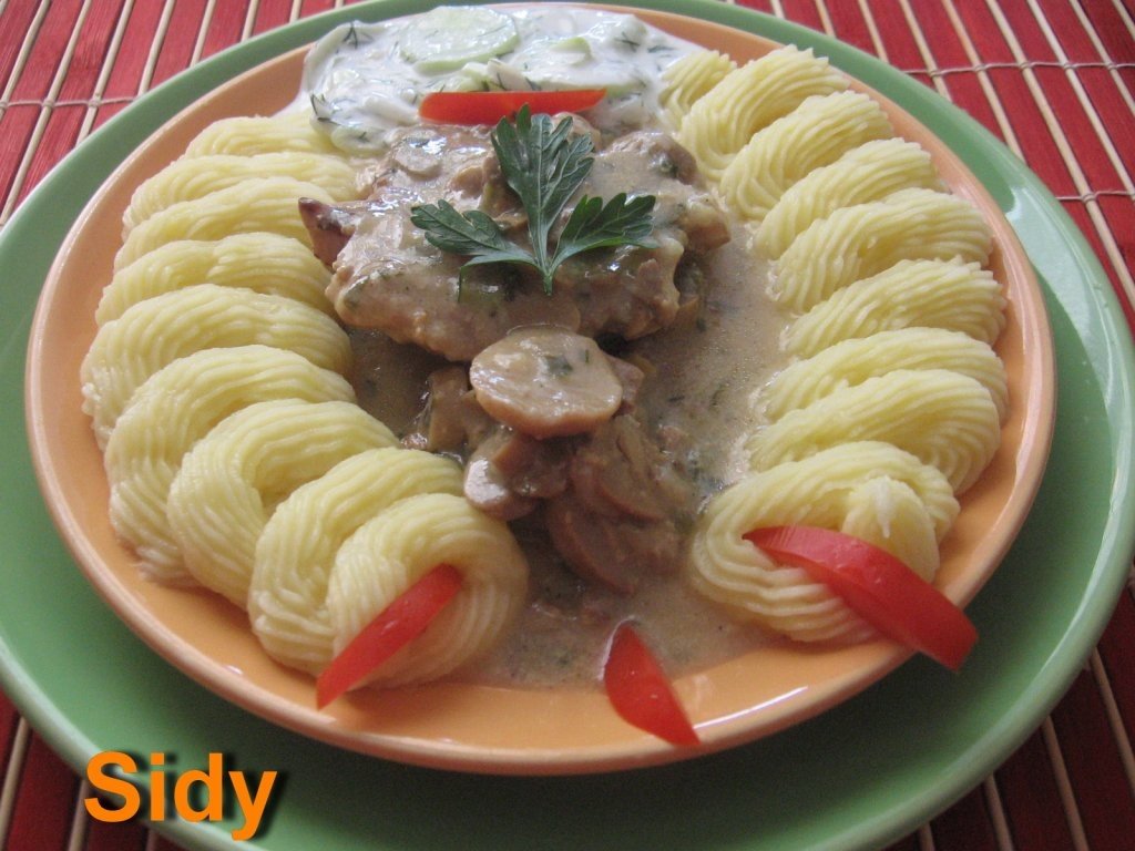 Cepele se taie marunt si se calesc in putin unt.Adaugam peste ele ciupercile taiate , mustarul , usturoiul pisat si laptele. Amestecam bine si adaugam bucatile de gratar prajite.Daca mai este nevoie mai adaugam putina apa sa fiarba bine carnea.