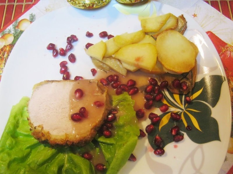 Si acum toate fiind gata, putem trece la montarea farfuriilor.Cate o felie de cotlet, una cu cartofi, vreo doua linguri de sos peste cotlet si boabe de rodie peste toate.