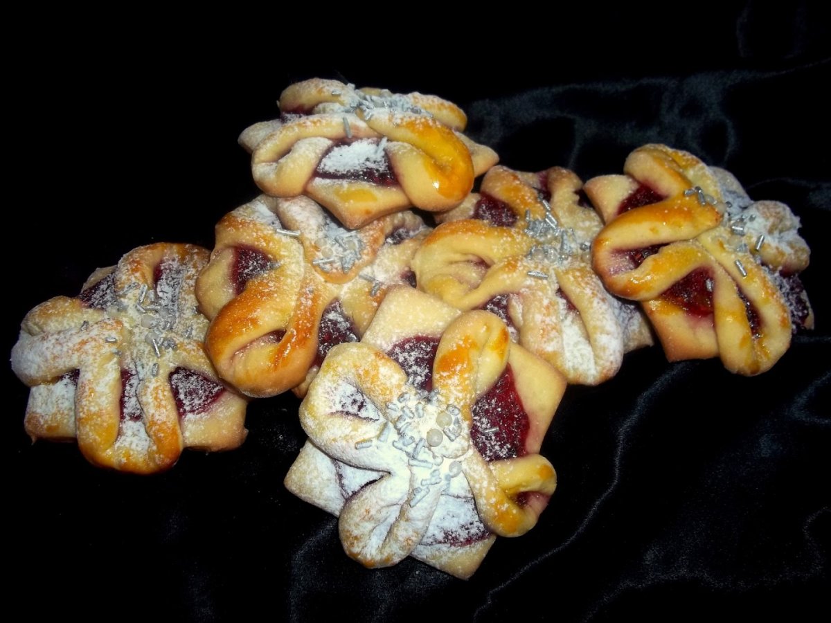 Pui 3 ouă, restul de zahăr, esenţa, zahărul vanilat şi frămânţi până obţii un aluat potrivit de tare. Adaugi şi lingurile de ulei şi frămânţi până când aluatul nu se mai lipeşte de mâini. Acoperi vasul cu un şervet curat şi îl laşi 30 de minute, la căldură. Din aluat întinzi o foaie groasă, după care tai pătrate mai mari. Pui câte o lingură de gem de căpşuni pe fiecare pătrat, apoi uneşti colţurile opuse. Baţi ouăle rămase şi ungi cu o pensulă fiecare floricica.