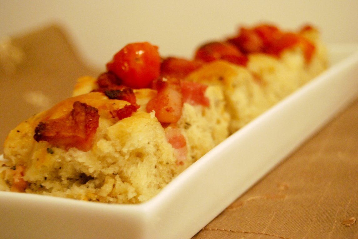 Incalziti cuptorul la 220 grade. Mai bateti coca un minut. Puneti intr-o tava de 40x30 unsa cu ulei de masline, intoarceti coca pe ambele parti sa se acopere cu ulei. Faceti gauri in coca cu degetele. Aranjati deasupra rosiile si sunca, presarati sare si piper. Lasati la cald 10 minute apoi bagati in cuptor pentru 15-20 de minute.