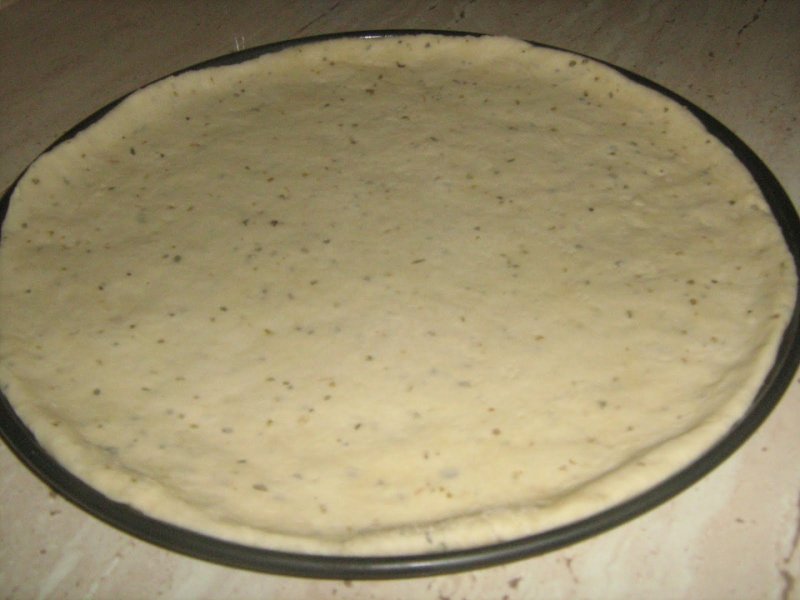 Se dizolva drojdia in apa calduta. Se adauga sarea, zaharul si uleiul de masline. Se adauga faina si oregano si se framanta bine. Se intinde aluatul in tava unsa cu ulei. Se da la cuptor pentru 10-15 minute.