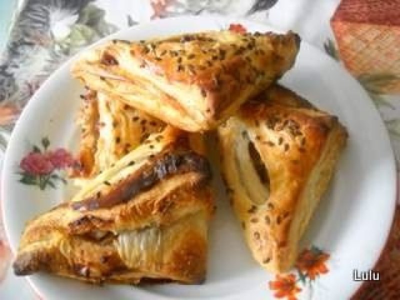 Merele curatate de coaja,taiate cubulete,le calesc impreuna cu zaharul iar cand s-au inmuiat,adaug stafidele pe care le-am tinut in apa calduta apoi le-am clatit cu apa rece,inchid focul,adaug scortisoara si omogenizez compozitia;pe fiecare patrat de foetaj,pun cate 1lingurita de mere,ung cu ou batut marginile apoi formez un triunghi,deasupra fac o taietura cu cutitul,ung triunghiul cu ou,cine doreste poate presara diferite seminte apoi le pun in tava pe hartie de copt la foc mare pentru 3-4min;se servesc si calde si reci