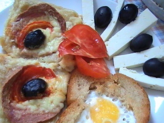 Intr-o tigaie pui putin ulei la incins. Asezi feliile de paine si le prajesti un pic pe o parte. Le intorci si dai drumul la cate un ou in mijlocul fiecarei felii.