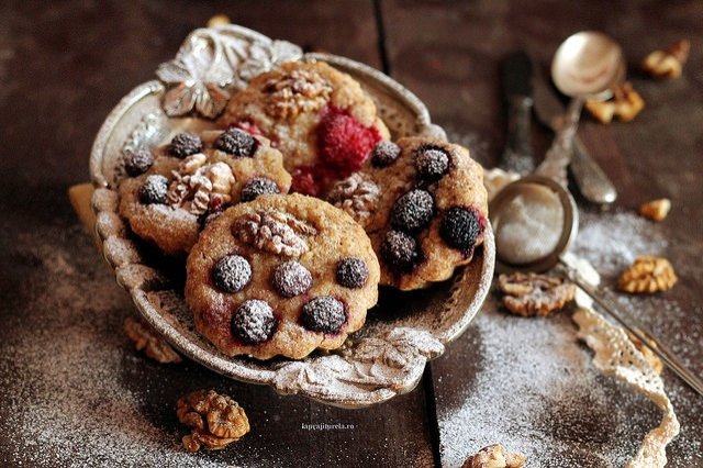 Adaugam albusurile peste restul ingredientelor deja amestecate si le incorporam usor. Impartim compozitia in 6 forme de briose (eu am folosit forme din silicon). Decoram fiecare briosa in parte cu cateva bucati de zmeura si cu cate o bucata de nuca.