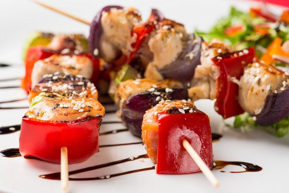 puneti carnea de pui, pestele si legumele alternativ pe betisoarele de bambus (nu este nevoie sa inmuiati in apa betisoarele).