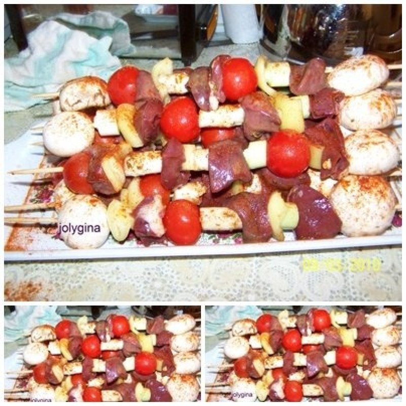 se spala ficateii, inimile se taie cubulete, ardeiul se curata si se taie si el patratele. Daca aveti arpagic il puneti asa cu tot cu coaja , ciupercile se curata de codite ,rosiile se lasa intregi