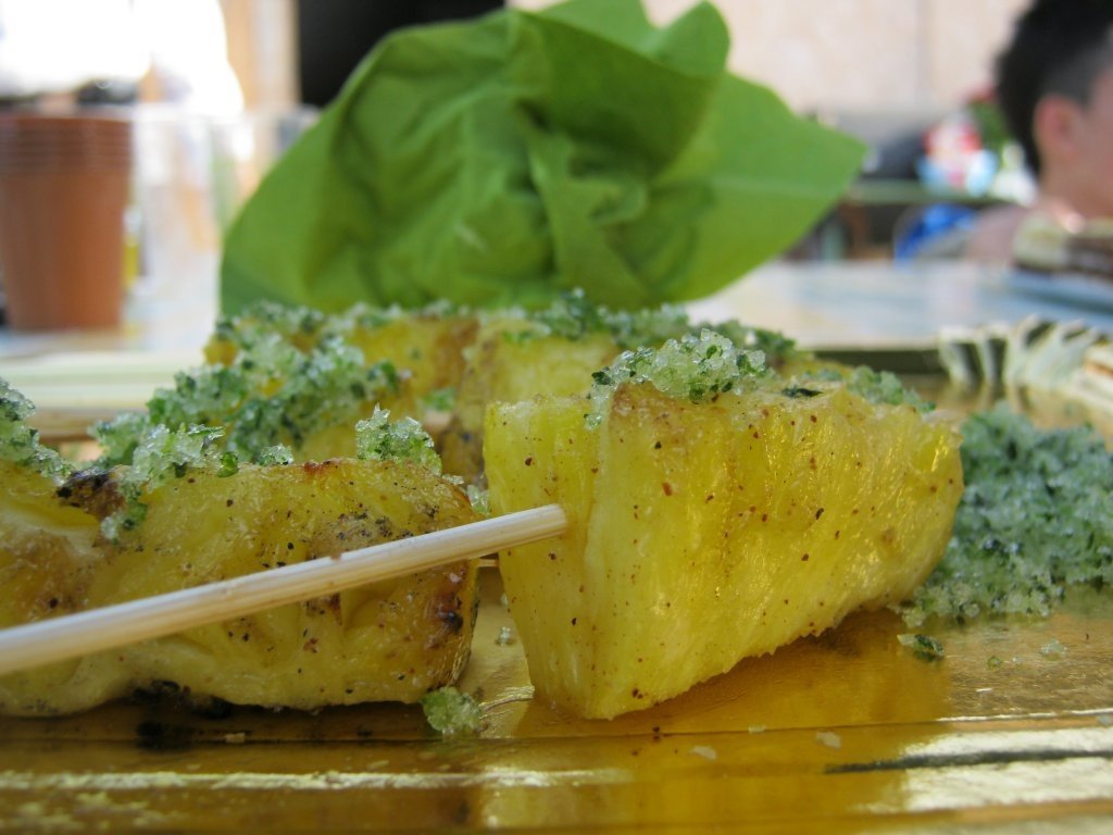 Ananasul astfel "macerat" se trece prin unt topit şi se înfige în ţepuşe pentru frigărui,după care se prăjeşte pe grătar,cam 2-3 min.pe fiecare parte.
