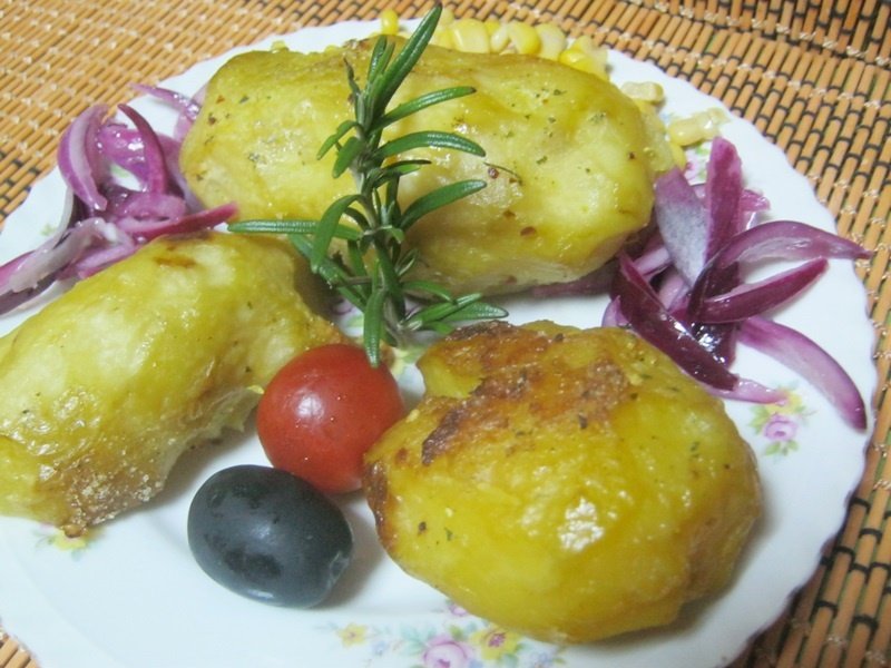 Dupa ce sunt copti, putem servi cartofii alaturi de ce ne place....eu i-am servit alaturi de ceapa rodie, masline , rosii si porumb.