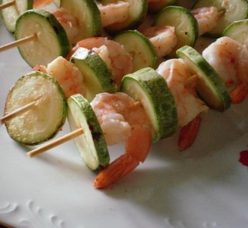 Dupa cele 30 de minute, da-ti drumul la gratar (puteti face frigaruile la disc), lasati-i timp sa se incinga, si pregatiti frigaruile. Puneti alternativ rondele de dovlecel, apoi crevetii etc. Pune cele 4 frigarui pe gratarul sau discul incins si intorceti-le din cand in cand. Nu trebuie sa stea mai mult de 2 minute pe o parte. Crevetii trebuie sa fie moi, iar dovleceii la fel. Puteti servi si o salata de cruditati, fara dressing din comert.