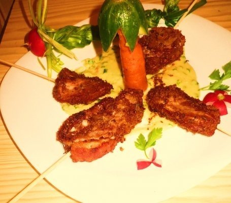 pasul 2: se scot coastele de porc din marinata, se tavalesc printr-un amestec de pesmet cu zahar brun si se prajesc in ulei incins.