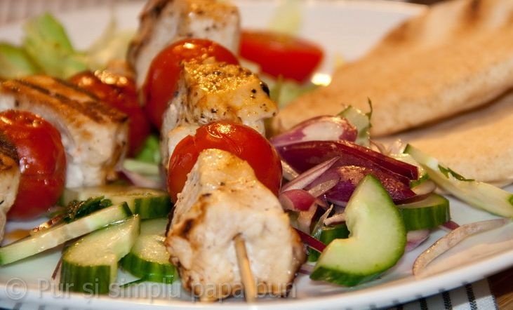 Salata verde se spală, se taie fâșii și se adaugă la amestecul de castravete cu ceapă roșie și se împarte pe 4 farfurii. Am așezat deasupra câte 2 frigărui și le-am servit împreună cu bucăți de lipie încălzită.