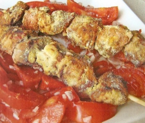 Pe farfurie se aseaza salata si peste ea se pun frigaruii.Se serveste cald.