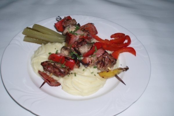 Preparatul se asambleaza astfel; cu ajutorul unui pos cu dui se pune piure in farfurie, sub forma de cerc: in interior se pune salata de varza alba : pe patul de vazra se pun frigaruile de ficatei : in lateral se aranjeaza bastonasele de legume murate. Pe frigarui se poate presara patrunjel proaspat tocat.
