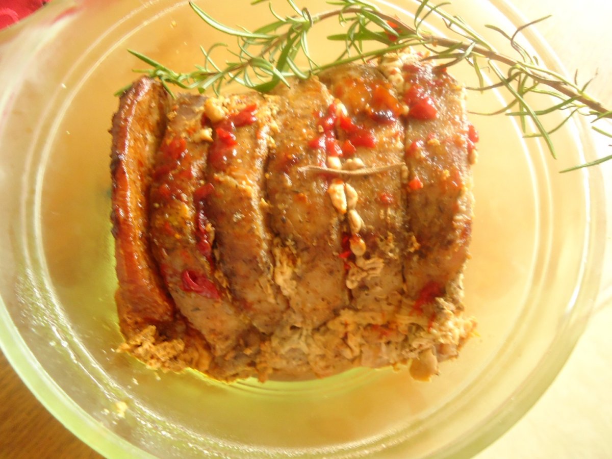 Incing un vas cu ulei,rumenesc bucata de carne pe ambele parti, apoi adaug celelalte ingrediente, apa, vinul si le dau la cuptor. Intorc periodic. Cand carnea este patrunsa,strecor sosul. Cu ajutorul unei pensule intind uniform dulceata de ardei iute peste bucata de friptura, asez in vasul cu sos strecurat si mai dau la cuptor pentru cateva minute.Putem pregati friptura din timp si inainte de servire o incalzim tapetata cu dulceata de ardei iute. Servim ornata cu rozmarin proaspat.