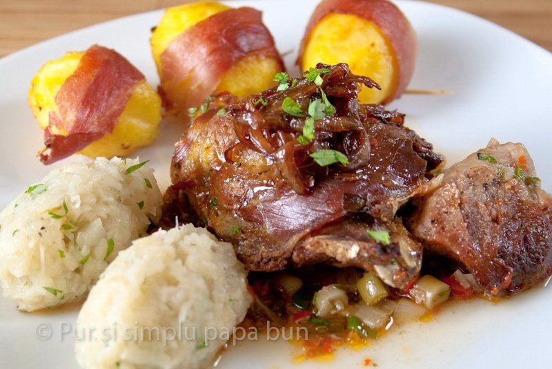 Într-un vas ceramic am pus ceapă și usturoi verde tocate, peste care am așezat bucățile de pulpă de porc, am presărat boia, sare, piper, oregano și rozmarin, am tunat vin și apă, pentru completare, am acoperit cu folie de aluminiu vasul și l-am dat la cuptor pentru o oră.