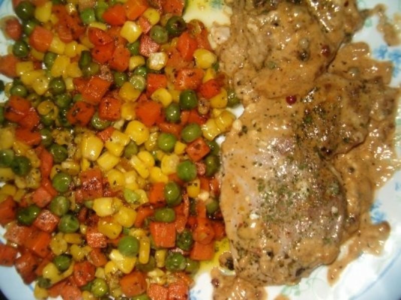 Se feliaza carnea si se bate usor sa se subtieze putin.Se pune la prajit intr-o tigaie antiaderenta cu putin unt.Se rumeneste carnea pe ambele parti si se adauga boabele de piper.Cand este gata ,se toarna peste carne amestecul de mai jos : smantana dulce se amesteca bine cu feta pana se omogenizeaza apoi se adauga mararul si usturoiul granulat.Cu acest amestec se mai lasa la foc mic aprox 10 minute.Se serveste cu garnitura de cartofi,orez sau legume cu unt.