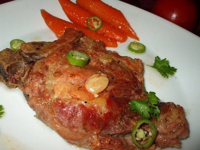 Scoateti tava, intoarceti cotletele pe cealalta parte, adaugati usturoiul feliat si cateva feliute de peperoni. Daca nu mai este lichid in tava, completati cu 3-4 linguri de apa fierbinte sau supa. Dati din nou tava la cuptor, la foc mediu 15-20 minute, pana ce friptura se rumeneste frumos.