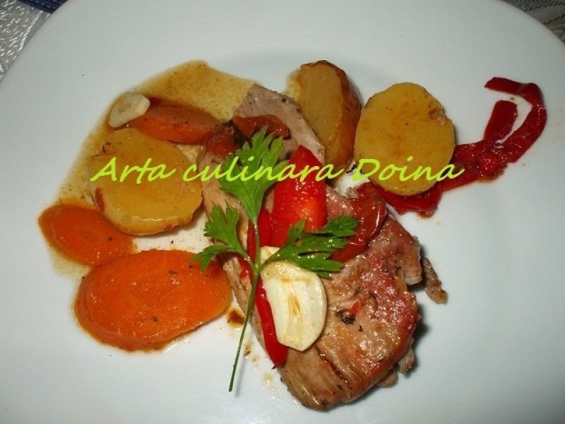 Indepartati folia, mai lasati friptura in cuptor inca 25-30 minute si este gata. Scoateti pe platou pulpa, taiati-o felii mai grosute si asezati langa ea legumele si marul din tava. Mai turnati deasupra putin sos din tava si decorati cu verdeata si feliute de usturoi.