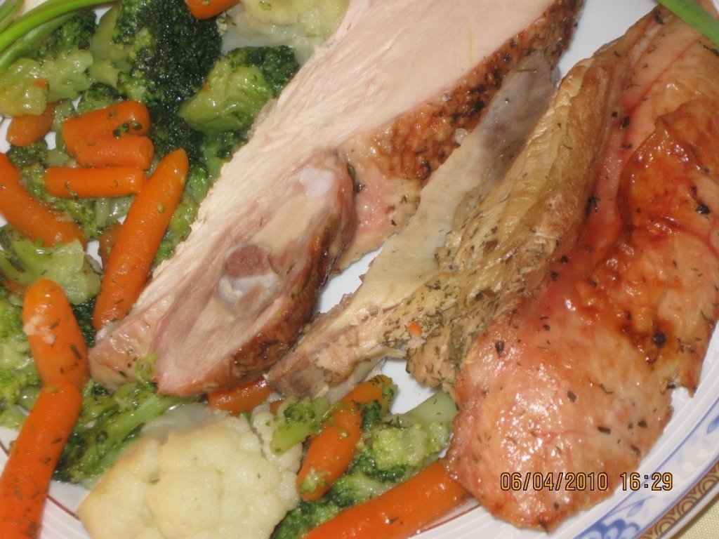 Carnea se spala ,se lasa la scurs ,se condimenteaza cu sare si se lasa la rece circa 1 ora .Dupa aceea carnea se stropeste cu ulei de masline si se condimenteaza cu oregano .Se aseaza intr-o tava in care am pus putina apa ,vinul, foile de dafin, frunzela de ceapa rupte in 3-4 bucati,usturoiul taiat, ardeiul taiat si el fasiute, rosiile taiate rondele,feliile de lamaie,fisiile de pastarnac.Se da la cuptor si din cand in cand se stropeste cu zeama din tava. Se lasa sa se rumeneasca bine.Se scoate din cuptor ,se lasa sa se raceasca si apoi se taie felii.Se serveste alaturi de o garnitura si se stropeste cu sosul din tava.