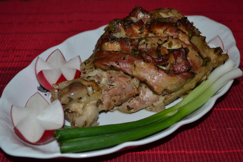 Scoti carnea din marinata, o impanezi cu felii de usturoi si de bacon si o pui in tava, apoi o stropesti cu ulei de masline si o presari cu cimbru, busuioc, piper si sare dupa gust.