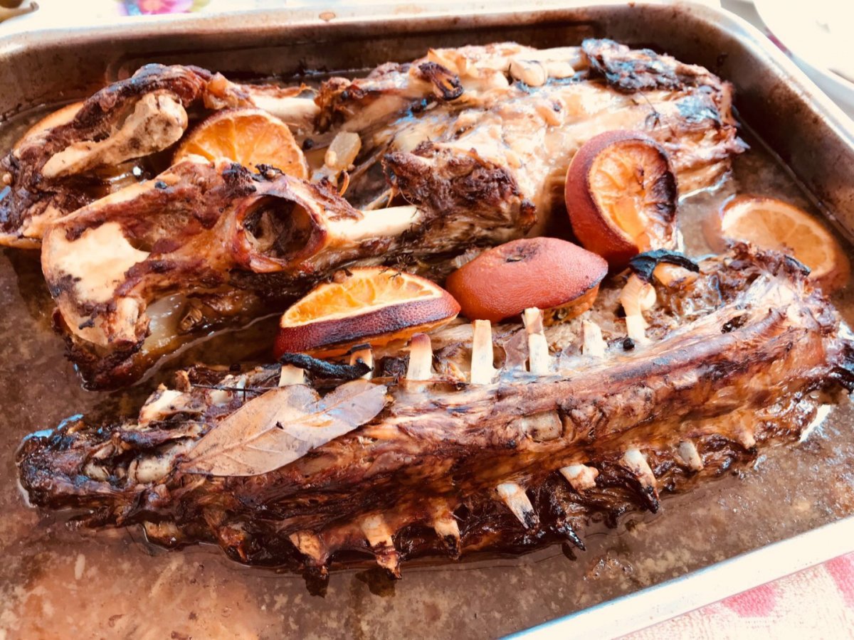 După acest interval, șirele, se scot din marinadă, atenție nu se spală, doar se scurg bine și se așează într-o tavă termorezistentă. Se stropesc cu puțin ulei, se adaugă căței de usturoi în coajă, și feliile de slănină se pun deasupra pulpelor din loc în loc. Friptura să dă la gătit în cuptorul preîncins cca. 15 minute până ce prinde culoare, întorcîndu-se pe toate părțile, apoi se stinge cu cca. 200 ml vin, se acoperă și se lasă la gătit la foc mic, 100 grade, cca. 180 de minute.