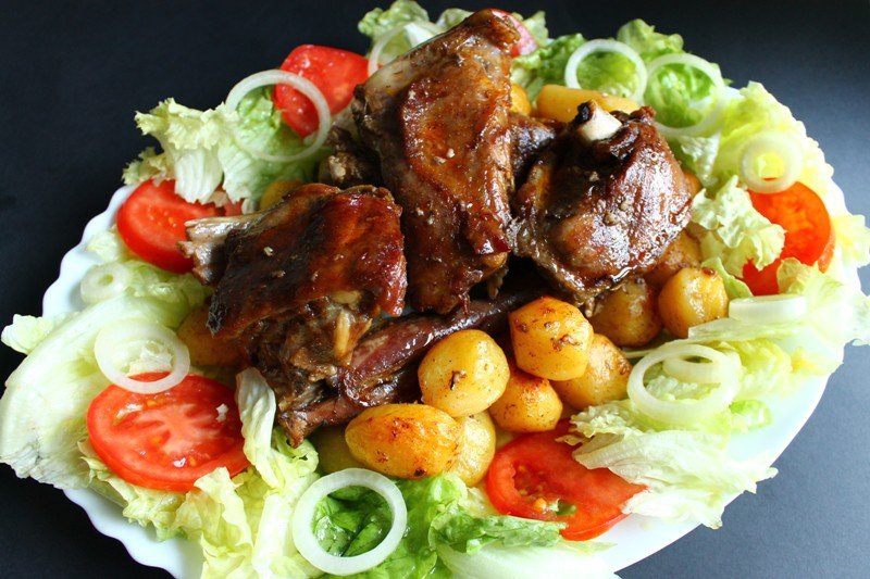 Din jumatate in jumatate de ora, stropim cu vinul rosu doar carnea, iar cam pe la jumatatea timpului de coacere, intoarcem bucatile pentru a se rumeni pe ambele parti.