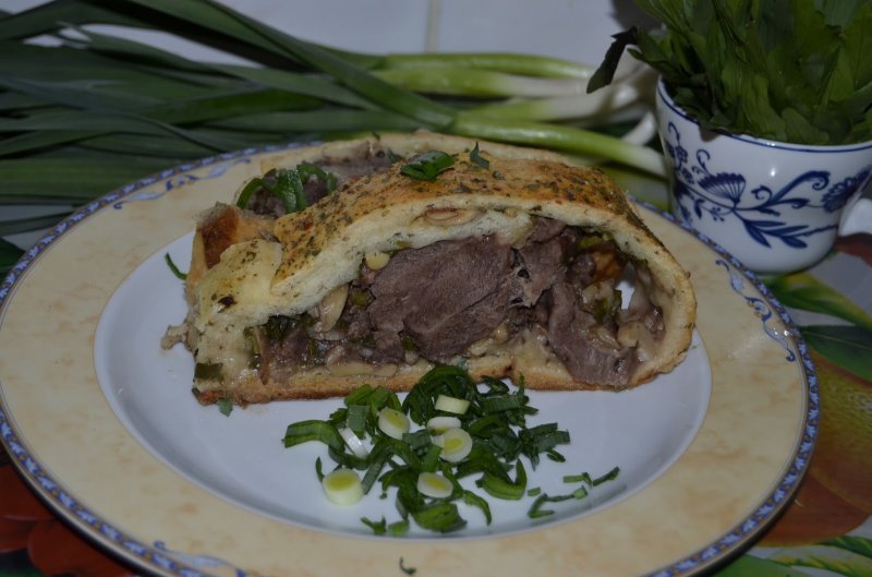 Dupa ce se intinde foaia de aluat se presoara din abundenta usturoi verde tocat,ceapa verde tocata,leustean,ciupercile trase la tigaie si se aseaza carnea prajita.Se ruleaza usor si se aseaza in tava in care se pune hartie de copt.Se ung cu ou batut si se presoara legume deshidratate,apoi se dau tavile la cuptor,la foc potrivit,pana cand se coc si se rumenesc frumos.Sa aveti pofta dragilor!