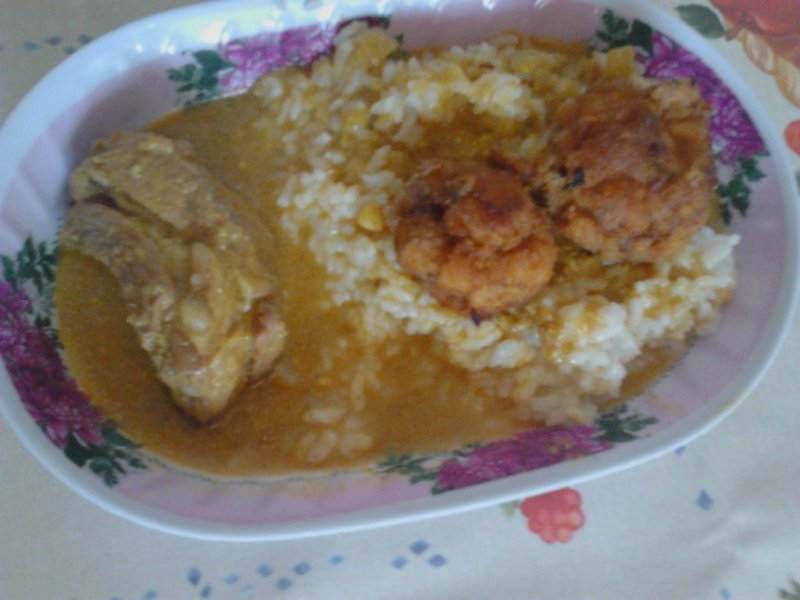 Orezul se spala bine si se pune la fiert in apa 20 minute, se sareaza dupa gust, se stinge focul si se lasa acoperit pana se umfla si este moale. Carnea de porc se marineaza in iaurt si turmeric, boia iute, coriandru, 3 ore (eu le-am tinut numai 30 minute). Se pune ceapa, se caleste 10 minute, se adauga ginger, usturoi, sare si se amesteca continuu, se adauga carnea marinata cu tot sosul si se lasa 30 minute sa se caleasca, apoi se adauga restul de condimente si sa lasa inca 20 minute. Se serveste cu garnitura de orez. Pofta buna!