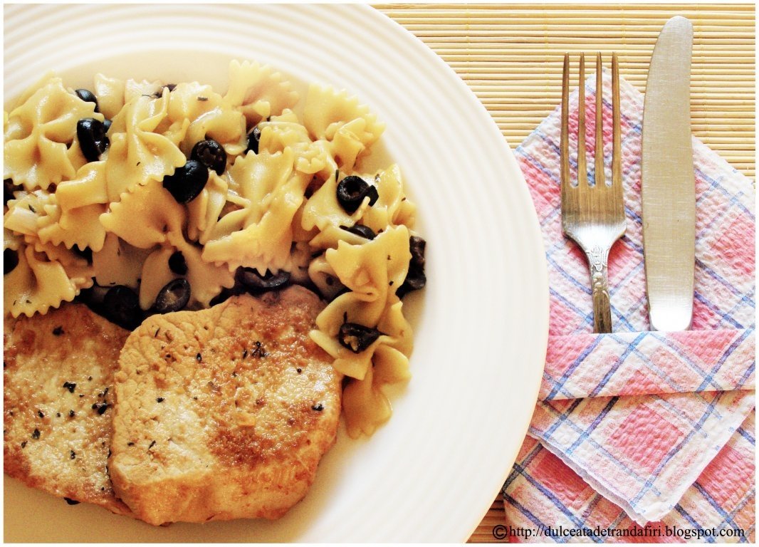 Intr-un vas se pune 1 litru jumatate de apa la fiert, cu putina sare. Cand incepe sa clocoteasca se pun pastele, timp de 15 minute si se amesteca din cand in cand. Concomitent, intr-o tigaie, se pun la prajit bucatile de porc. Cand sunt rumenite, se adauga peste ele sosul in care au stat, plus jumatate de pahar de apa, maslinele si usturoiul pisat. Se pune capacul si se lasa la fiert inca 2-3 minute. Pastele se pun intr-un bol, peste ele se toarna sosul de la friptura si se amesteca bine. Acest fel de mancare se serveste cat e fierbinte. Sa ai pofta!