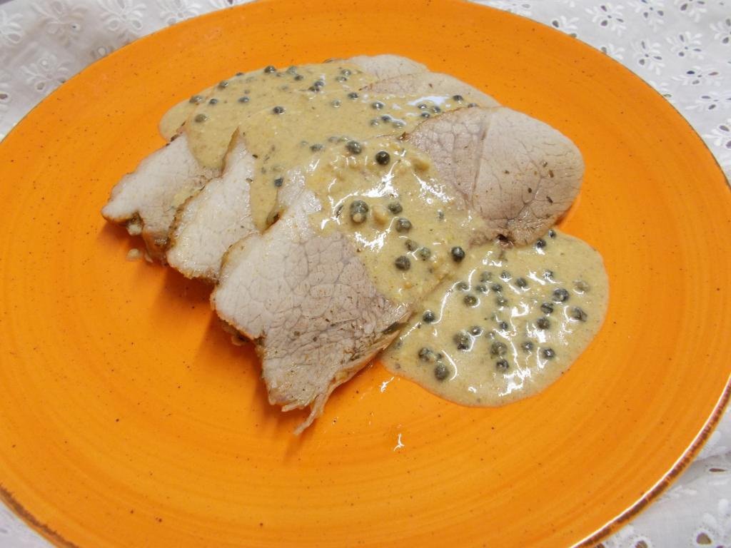 Scoatem dupa 45 min carnea din punga, golim sosul rezultat peste carne si mai dam din nou tava cu carne la cuptor pentru a se rumeni putin.Cand s-a rumenit carnea,scurgem sosul intr-o tigaie, adaugam mustarul si smantana. Adaugam peste 1-2 min si boabele de piper si mai lasam 1 minut pe foc.Carnea se feliaza pentru a fi servita.